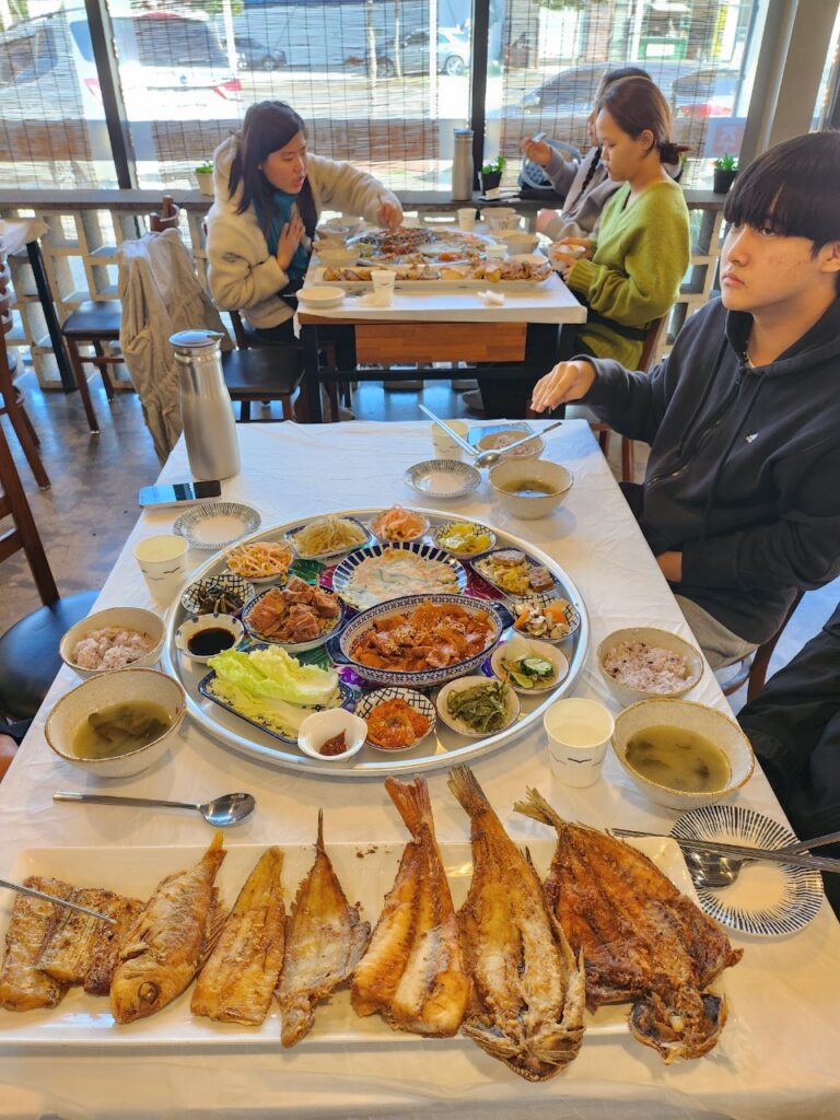오늘의 메뉴: 다같이 둘러 앉아, 주변 인근 맛집의 한정식을 찾았습니다. 여러종류의 반찬들과 제육볶음 및 구운 생선들과 푸릇푸릇한 야채들이 보이네요. 푸근한 엄마의 밥상의 생각이 나네요. 하하호호 즐거운 식사 시간 🙂